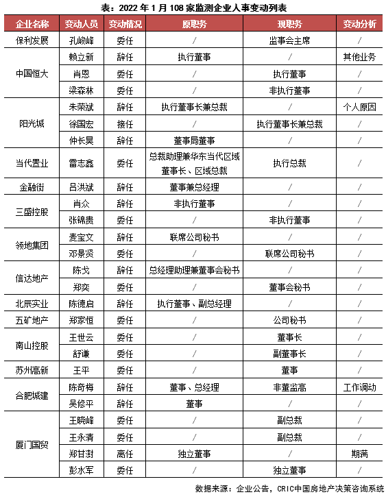 1月,房企高層人事動態(tài)信息數(shù)量較前一月有所減少,從108家監(jiān)測企業(yè)的人事變動情況來看,房企對組織架構(gòu)的調(diào)整、管理層重組都有所減緩。