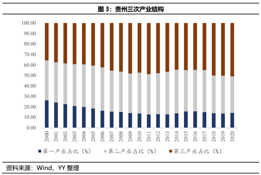 產業結構來看,由于煙酒、特色食品、醫藥等傳統產業的存在,貴州第一產業比重仍然較高;近三年來,作為基建大省的貴州固投增速顯著放緩,煤炭等傳統能源密集型產業規模也有所萎縮,二產占比隨之下降;依托數字經濟、旅游、煙酒等對相關產業的帶動,貴州三產比重近年來已超50%。目前貴州支柱產業仍是主要依托于區域自然稟賦驅動的電力、能源、建材、煙酒、化工等,兼以發展先進裝備制造、基礎材料、生態特色食品、大數據電子信息以及健康醫藥。