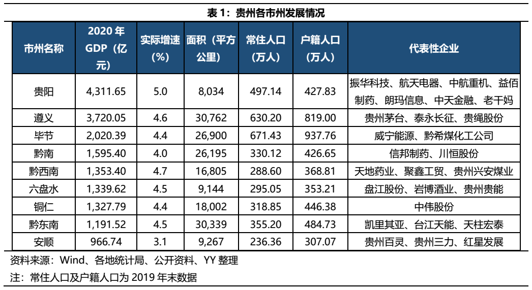 貴州地處我國西南腹地,北接川渝,東毗湖南、南鄰廣西、西連云南,截至2020年末,全省公路通車里程20.67萬公里,實現了“縣縣通高速”,全年全省鐵路、公路、水運貨物運輸總量86,444.63萬噸、旅客運輸總量40,136.73萬人,民航旅客吞吐量2,253.16萬人次,是我國西南地區交通樞紐。貴州地貌素有“八山一水一分田”之說,全省面積中92.5%為山地及丘陵,這也是造成歷史上貴州經濟發展緩慢的原因之一。不過貴州自然資源稟賦強,汞、磷、鋁土礦、煤炭等礦產資源、水資源以及生物資源儲量豐富。目前貴州省轄6個地級市、3個自治州,2019年末常住人口3,622.95萬人,城鎮常住人口占49.02%,戶籍人口4,571.45萬人,城鎮化進程相對滯后且人口流出嚴重。