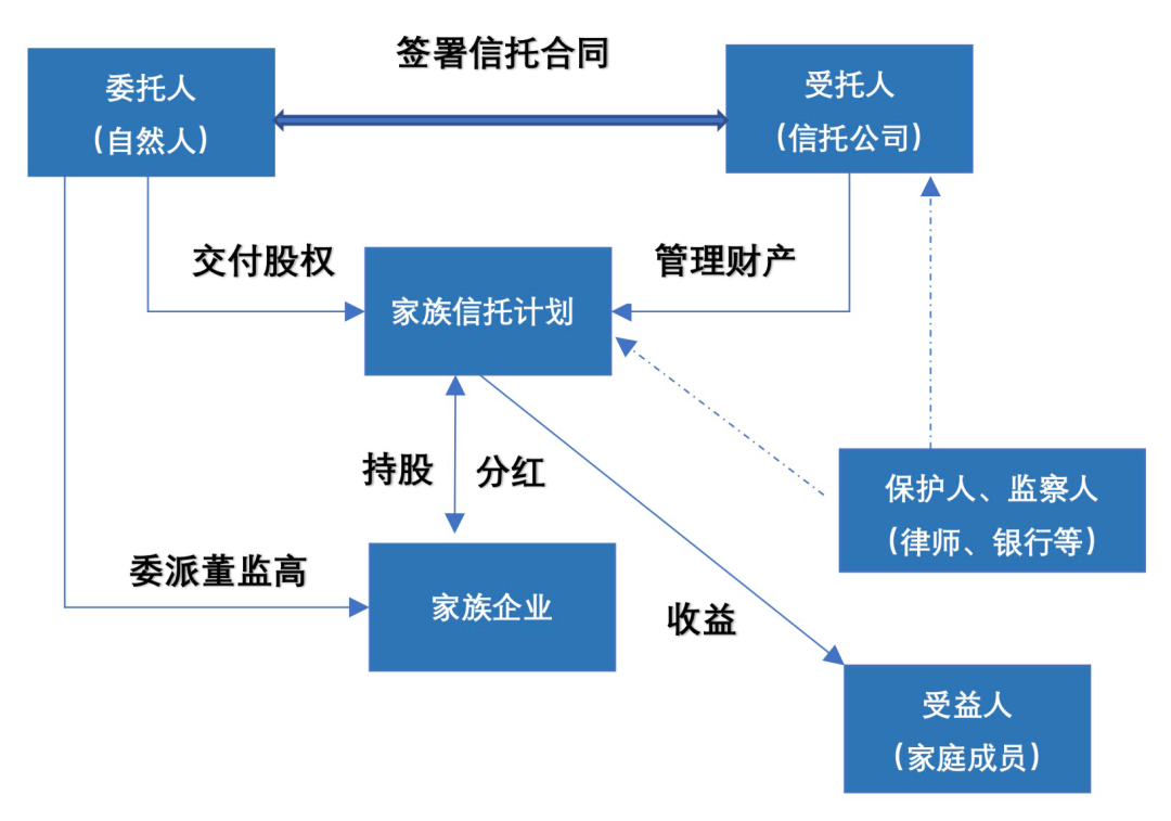 根據(jù)《信托法》第14條的規(guī)定,股權(quán)信托不僅包括以股權(quán)為標(biāo)的而設(shè)立的信托,還包括以資金財(cái)產(chǎn)為標(biāo)的而設(shè)立,期間受托人通過(guò)收購(gòu)或者增資,將資金信托財(cái)產(chǎn)轉(zhuǎn)化為有限合伙企業(yè)份額、控股公司股權(quán)、股權(quán)投資基金份額等方式設(shè)立的信托。具體而言,股權(quán)家族信托就是將委托人擁有的公司股權(quán)或?qū)①Y金信托財(cái)產(chǎn)轉(zhuǎn)化為有限合伙企業(yè)份額、控股公司股權(quán)、股權(quán)投資基金份額等,并作為信托財(cái)產(chǎn)放入家族信托中進(jìn)行管理保護(hù),以達(dá)到隔離債務(wù)、延稅節(jié)稅、離婚保護(hù)、身后傳承及多代保障的目的的信托計(jì)劃。