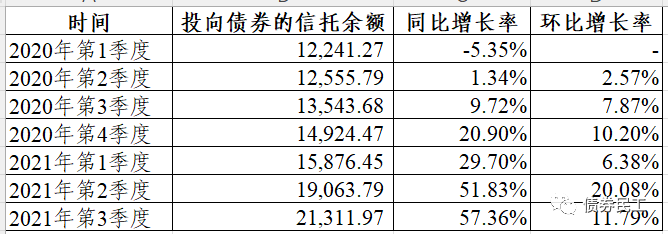 再來看第二組數據,根據中國信托業協會公布的2021年3季度末信托公司主要業務數據,信托產品投向債券的規模為2.13萬億元,同比增長分別為57.36%!這個增長速率高的有點嚇人。為了更好的了解投向債券的信托產品情況,債券民工根據中國信托業協會公布的統計數據,專門提取了最近兩年的投向債券的信托余額數據,具體數據情況見下表: