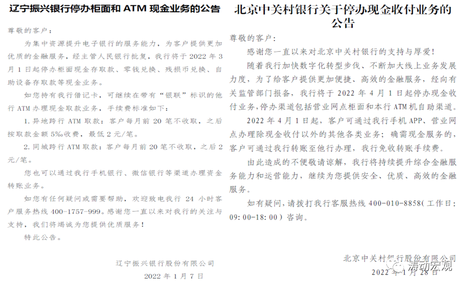 具體看,2022年1月7日,遼寧振興銀行發(fā)布《停辦柜面和ATM現(xiàn)金業(yè)務(wù)的公告》,明確自2022年3月1日起將停辦柜面現(xiàn)金存取款、零錢兌換、殘損幣兌換、自助設(shè)備存取款等現(xiàn)金業(yè)務(wù)。隨后1月28日,北京中關(guān)村銀行亦發(fā)布《關(guān)于停辦現(xiàn)金收付業(yè)務(wù)的公告》,明確自2022年4月1日起停辦現(xiàn)金收付業(yè)務(wù),停辦渠道包括營業(yè)網(wǎng)點(diǎn)柜面和本行ATM機(jī)自助渠道。