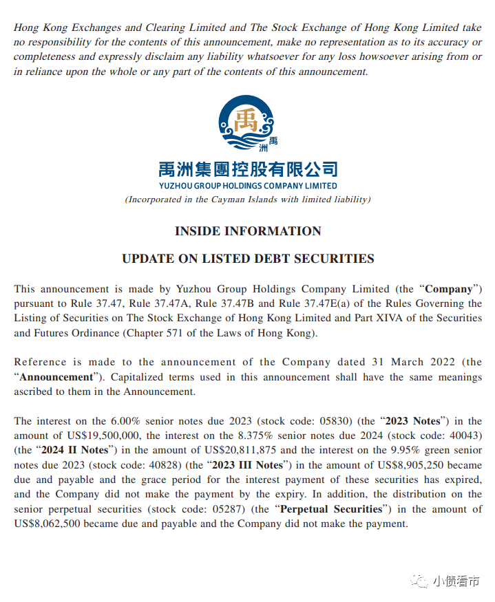 5月31日,禹洲集團(01628.HK)公告稱,公司未在寬限期屆滿時兌付2023年到期票息6%優先票據、2024年到期票息8.375%優先票據、2023年到期9.95%綠色優先票據的利息,構成違約事件。