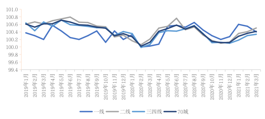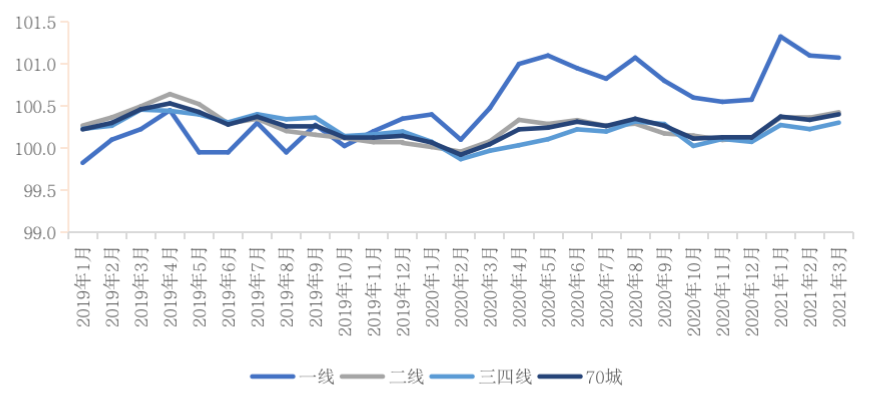 圖:2019年1月-2021年3月70城及各能級城市新建商品住宅價格指數環比走勢