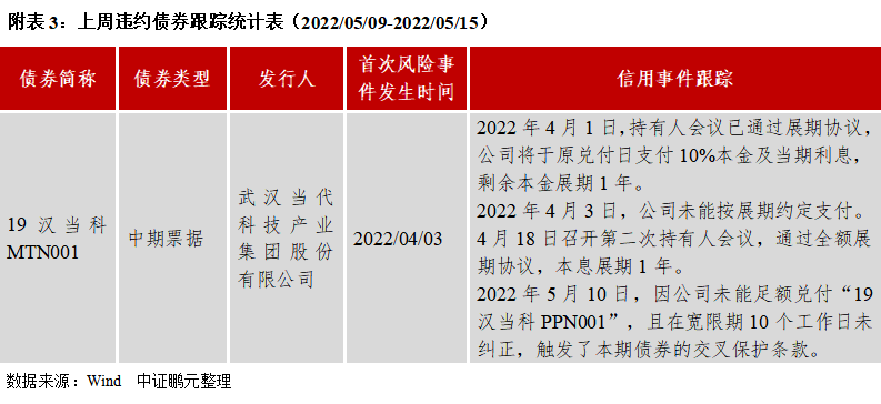 上周發生3起信用風險事件:廣州富力地產股份有限公司(19富力02,延期兌付)、武漢當代科技產業集團股份有限公司(17漢當科MTN002,交叉違約)、深圳市鉅盛華股份有限公司(21深鉅03,延期兌付)。