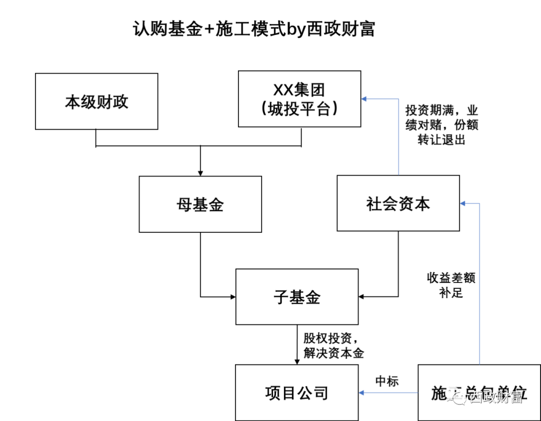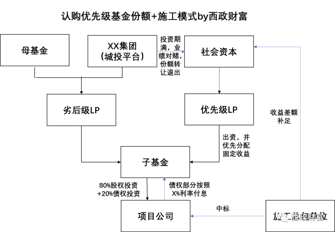 (1)施工單位或其引入的資金作為社會資本方(下稱“合作方”)按照項目總投資一定比例(如10%)認繳XX投資基金(母基金)的項目專項子基金。項目專項子基金以股權(quán)形式向項目公司進行投資,為項目提供資本金。