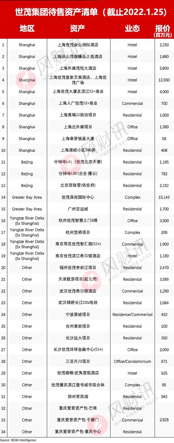 風財訊從世茂待售資產包看到,34個重點項目,以綜合體商辦為主。上海世茂廣場(含皇家艾美酒店)和世茂深港國際中心兩個項目報價都超過百億,分別為135.55億和151.43億元;