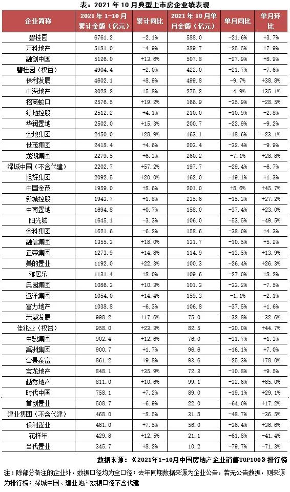 從企業表現來看,38家典型上市房企中,單月業績同環比雙降的房企達14家。同時,逾半數企業單月同比下降超20%。整體來看,10月房企單月業績表現不及上半年及歷史同期。值得注意的是,10月僅中國金茂同比增長8.6%,單月實現業績201億元。碧桂園、融創、保利10月單月銷售業績表現相對突出,規模均在500億元左右。