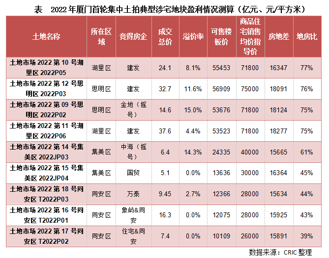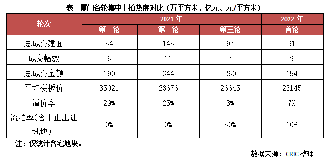 對(duì)比2021年第三輪集中土拍,廈門(mén)2022年首輪集中土拍熱度明顯上漲,整體溢價(jià)率高達(dá)7%,較去年第三輪明顯提升。