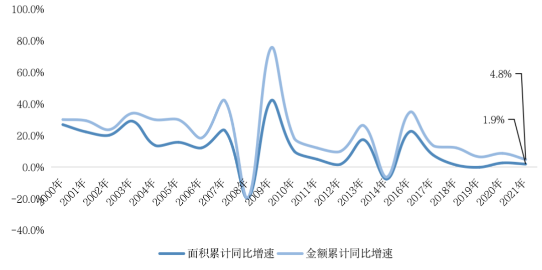 2021年,全國房地產開發投資147602億元,比上年增長4.4%;全國商品房銷售額再創新高,達181930億元,增長4.8%。2021年上半年商品房銷售面積較下半年同比增13個百分點,上半年較好的市場表現是全年創新高的主要支撐。