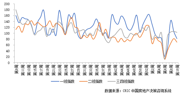 2022年第10周成交整體小幅回落。一線城市成交指數(shù)為82.12,環(huán)比下降23.46點;二線城市成交指數(shù)為69.79,環(huán)比下降11.88點;三四線城市成交指數(shù)為103.46,環(huán)比下降2.96點。