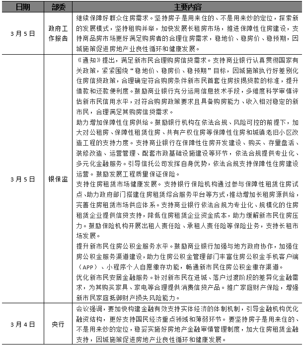 中央層面,政府工作報告提到要支持商品房市場更好滿足購房者的合理住房需求,央行、銀保監(jiān)會表示優(yōu)化住房金融服務(wù),緩解新市民住房壓力。
