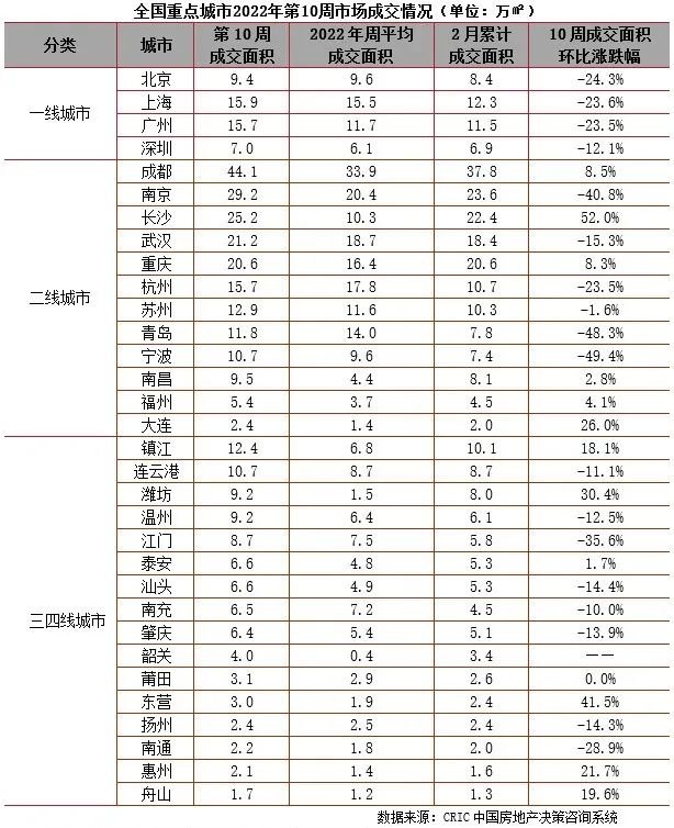 2022年第10周,全國新房供應(yīng)回升,成交整體回落。供應(yīng)方面,全國重點城市共取得預(yù)售證面積143萬平方米,環(huán)比增長47%。成交方面,一線四城成交環(huán)比均有所回落,其中,北京、上海、廣州降幅都在20%左右,深圳環(huán)比小幅回落,下降12%。二線城市成交環(huán)比漲跌參半,成都、長沙成交整體維持較高位水平,而南京成交高位回落,環(huán)比下降41%,青島、寧波成交環(huán)比近乎腰斬。三四線城市成交環(huán)比漲跌參半,連云港、溫州、汕頭環(huán)比小幅回落,降幅在10%左右,濰坊、鎮(zhèn)江、東營成交環(huán)比回升。