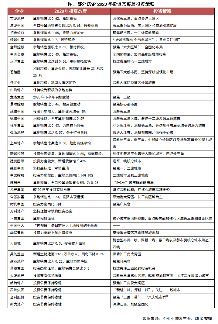 一季度末上市房企陸續(xù)公布了2020年成績單,業(yè)績會(huì)上部分房企透露了今年的銷售目標(biāo)和市場判斷,這無疑對(duì)未來企業(yè)投資策略產(chǎn)生巨大影響。整體而言,謹(jǐn)慎投資仍是主旋律,區(qū)域選擇仍聚焦長三角和粵港澳大灣區(qū),且在22城集中供地之下,普遍認(rèn)為提升投資質(zhì)量、拓寬投資渠道是突圍的核心競爭力。