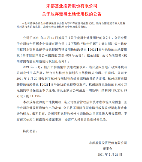 集中拍地過后的2個(gè)月零12天,宋都發(fā)布了放棄競(jìng)得土地使用權(quán)的公告: