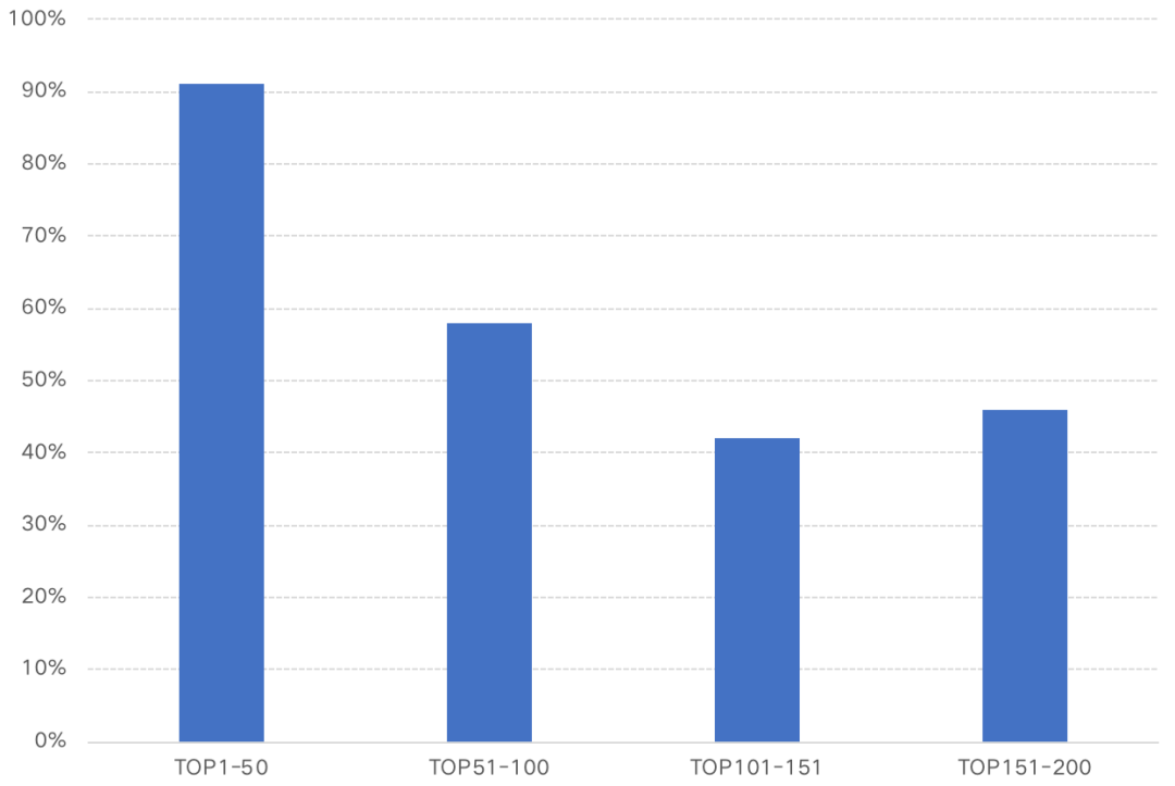 數據顯示,TOP200房企中,已上市房企的數量占比約為60%,從各規模房企的上市情況來看,TOP50以內的上市房企數量占比最多,超過了90%,值得注意的是,在中梁控股上市之后,TOP30房企基本實現全部上市。TOP51-100規模的房企上市數量占比約為58%,TOP101至200陣營的房企上市率也都超過了40%,
