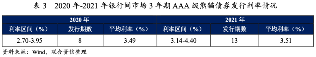 選取2020年—2021年在銀行間債券市場發行且樣本數量較多的3年期AAA級共計21期熊貓債券樣本進行比較,2021年在銀行間債券市場發行的3年期AAA級債券的平均發行利率為3.51%,同比小幅上漲0.02個百分點,融資成本整體保持穩定。