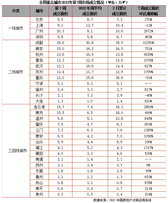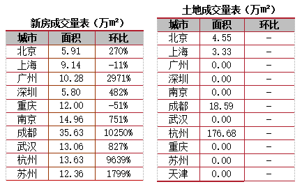 二線城市:除重慶、長沙外成交維持低位運行以外,其他二線城市成交基本都呈現(xiàn)探底回升走勢,環(huán)比漲幅超過100%。