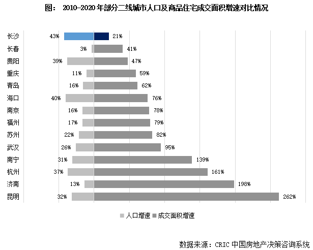 值得一提的是,與長(zhǎng)沙強(qiáng)人口吸附力形成鮮明對(duì)比的是長(zhǎng)沙樓市的不慍不火,具體來(lái)看,2010-2020年間長(zhǎng)沙市人口增量超過300萬(wàn)人,十年累計(jì)增速高達(dá)43%,在全國(guó)各熱點(diǎn)一二線城市中也位列靠前,我們統(tǒng)計(jì)了部分二線城市十年來(lái)人口增速及商品住宅成交面積增速發(fā)現(xiàn),長(zhǎng)沙的人口高增長(zhǎng)與其樓市表現(xiàn)存在嚴(yán)重背離,全市成交規(guī)模表現(xiàn)平穩(wěn),十年間僅增長(zhǎng)了21%,較之部分省會(huì)城市如昆明、濟(jì)南、南寧等160%以上的增幅相差甚遠(yuǎn);與同處中部的重慶、武漢也有較大差距,樓市成長(zhǎng)性較為滯后。