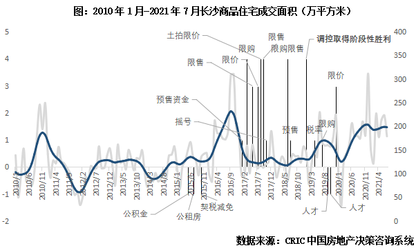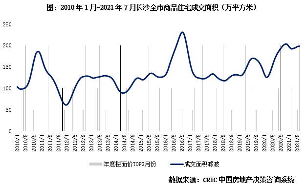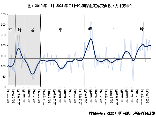 2016年后市場(chǎng)回歸理性,長(zhǎng)沙樓市在盤整波動(dòng)中小幅上行。2017-2018年成交恢復(fù)往年水平,市場(chǎng)進(jìn)入盤整期,2018年中“625新政”調(diào)控升級(jí),部分改善和炒房需求受到“重創(chuàng)”,市場(chǎng)開始緩步下行。直至2019年上半年才略有復(fù)蘇,下半年隨著二線城市成交熱度減退,購(gòu)房者觀望情緒加重,市場(chǎng)略有降溫,2020年疫后高端住房需求被再次放大,疊加利好政策頻出“托市”,全年成交量再度踩上2000萬(wàn)平方米。