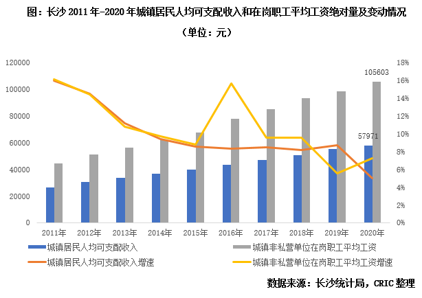 事實(shí)上,長(zhǎng)沙居民收入一直保持相對(duì)充沛的水平,我們列示了長(zhǎng)沙2011年以來(lái)城鎮(zhèn)居民人均可支配收入和在崗職工平均工資絕對(duì)量及變動(dòng)情況,可以看出,二者絕對(duì)量均保持正增長(zhǎng),截止2020年分別達(dá)到了5.8萬(wàn)元和10.6萬(wàn)元,增速呈波動(dòng)下行趨勢(shì),至2019年末維持在5%-7%。