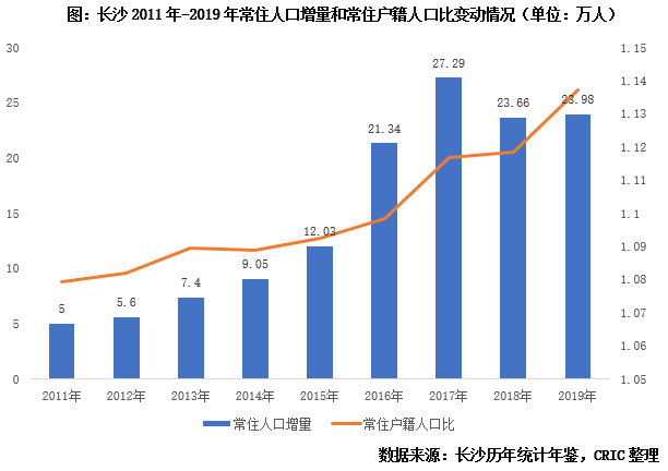 長(zhǎng)沙樓市在疫情后迎來(lái)“復(fù)蘇”,調(diào)控“松動(dòng)”,地價(jià)攀升是直接導(dǎo)火線,而背后更深層次的原因則是長(zhǎng)期積累購(gòu)買力的集中爆發(fā)。縱觀長(zhǎng)沙2011年以來(lái)常住人口增量變化,2011-2014年雖然逐年攀升,但每年增量均不足10萬(wàn)人,而步入2015年以來(lái)常住人口增長(zhǎng)明顯提速,每年增量均在25萬(wàn)人左右,且常住戶籍人口比始終保持穩(wěn)中有增態(tài)勢(shì),至2019年末已達(dá)1.14,保持人口凈流入。