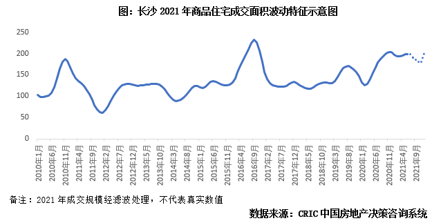 為了更好的預(yù)判1年之內(nèi)商品住宅成交面積的變動(dòng)量和上下行趨勢(shì),首先依據(jù)上文得到的長(zhǎng)沙短期樓市波動(dòng)的影響因素,2021年除法拍房精準(zhǔn)限購(gòu)以來(lái),并未出臺(tái)其他調(diào)控加碼措施,整體市場(chǎng)進(jìn)入了新的供求平衡期,預(yù)計(jì)7-10月將迎來(lái)小幅回調(diào),而參照歷史規(guī)律,11-12月有望“翹尾”回升,迎來(lái)年末的一次集中放量。