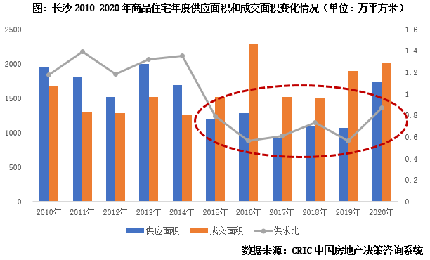若要預(yù)判2021年全年總量,我們認(rèn)為還需結(jié)合商品住宅供應(yīng)等相關(guān)指標(biāo),一方面市場(chǎng)供應(yīng)和存量決定了成交的發(fā)揮空間,即成交的上限;另一方面,通過對(duì)比長(zhǎng)沙歷年來(lái)商品住宅的供求面積,我們不難發(fā)現(xiàn),市場(chǎng)以2015年為分界點(diǎn),隨著供應(yīng)整體縮量,市場(chǎng)逐步由供過于求向供不應(yīng)求轉(zhuǎn)變,且年供求比基本保持在0.6-0.9之間波動(dòng),值得關(guān)注的是,2002年供應(yīng)顯著放量的情況下,供求差值也有縮小的趨勢(shì),供求比維持在0.87,因而可以將商品住宅供應(yīng)量作為判斷短期(1年內(nèi))成交是否放量的重要依據(jù)。