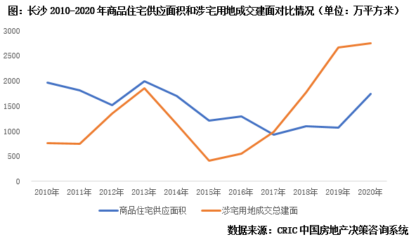 若要預(yù)判長(zhǎng)沙商品住宅供應(yīng)量,我們還需聚焦長(zhǎng)沙土地市場(chǎng),從下圖中可以看出,長(zhǎng)沙涉宅用地成交規(guī)模是商品住宅供應(yīng)面積的先行指標(biāo),按照房企拿地到項(xiàng)目入市1-2年的開發(fā)周期來(lái)推算,2010-2015年涉宅用地成交規(guī)模呈現(xiàn)出波動(dòng)下行趨勢(shì)也導(dǎo)致2012-2017年整體商品住宅供應(yīng)面積呈現(xiàn)出穩(wěn)步下行趨勢(shì),而自2016年以來(lái)整體涉宅用地成交規(guī)模由降轉(zhuǎn)增也帶動(dòng)了2018年以來(lái)商品住宅供應(yīng)面積的穩(wěn)步回升。