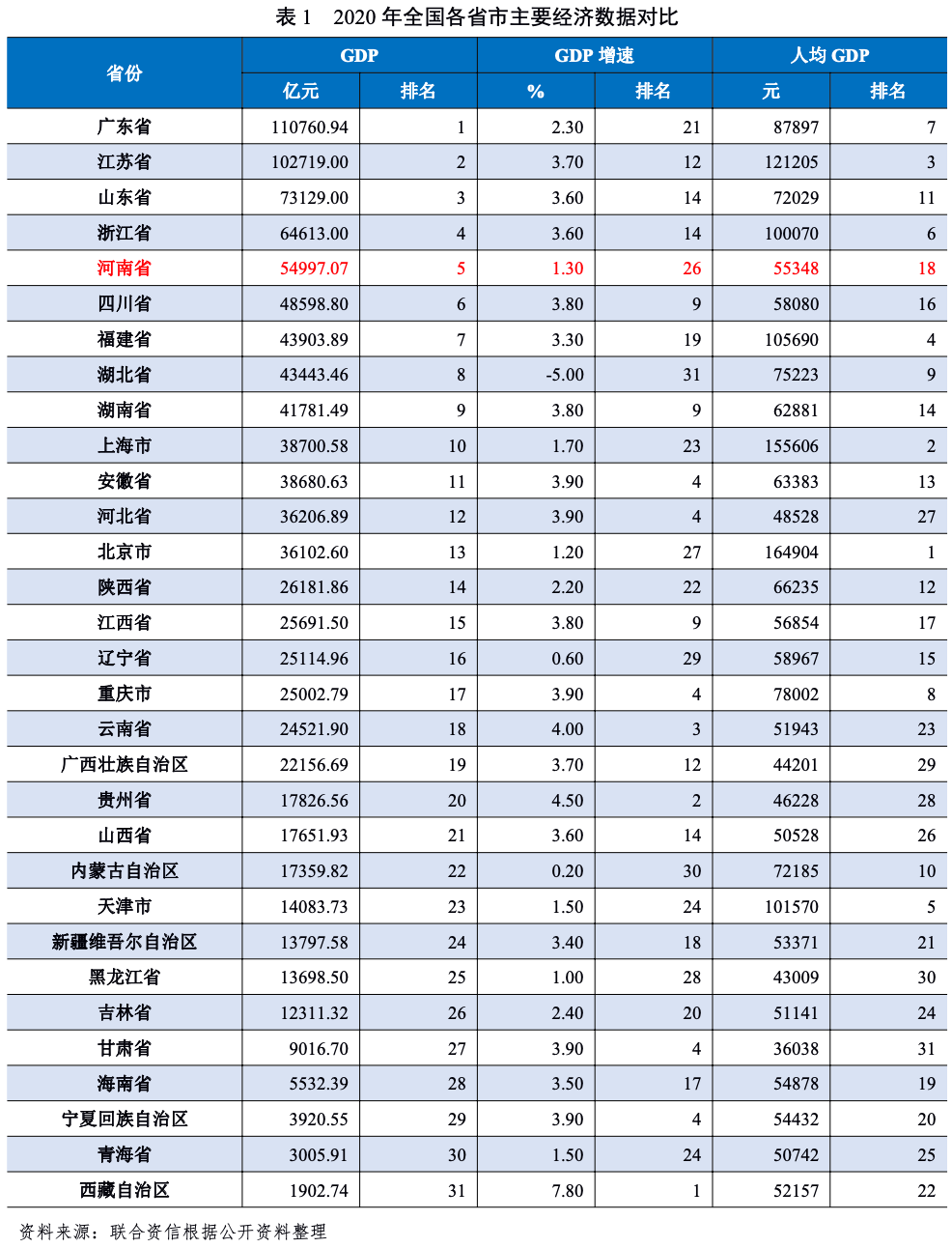 河南是我國農業大省,近年來,在中國經濟增速持續放緩的背景下,河南省經濟持續增長,但增速亦有所放緩。2018-2020年,河南省分別實現地區生產總值(GDP)48055.86億元、54259.20億元和54997.07億元,2020年經濟總量居于全國第5位。同期,河南省GDP增速分別為7.6%、7.0%和1.3%,2020年GDP增速低于全國GDP增速(2.3%)1.0個百分點,位居全國第26位。2020年,河南省人均GDP(5.53萬元)為全國平均水平的0.76倍,位居全國第18名。