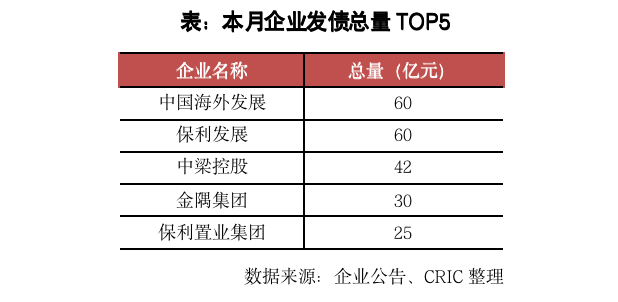 具體企業(yè)表現(xiàn)來看,5月發(fā)債量最大的企業(yè)是中海和保利發(fā)展,兩家企業(yè)的融資總量都是60億元,中海在本月發(fā)行了30億元的公司債以及30億元的中期票據(jù),保利也發(fā)行了30億元的公司債和30億元的綠色中期票據(jù)。本月發(fā)行債券的企業(yè)有17家,發(fā)債企業(yè)個數(shù)環(huán)比減少5家。從發(fā)債年限來看,最長的是保利置業(yè)發(fā)行的一筆長達12年的ABS。從債券發(fā)行利率表現(xiàn)來看,金隅集團發(fā)行的一筆30億元超短融利率2.08%最低,另有保利發(fā)展、中海地產(chǎn)以及華潤置地發(fā)行了利率不超過3%的債券。