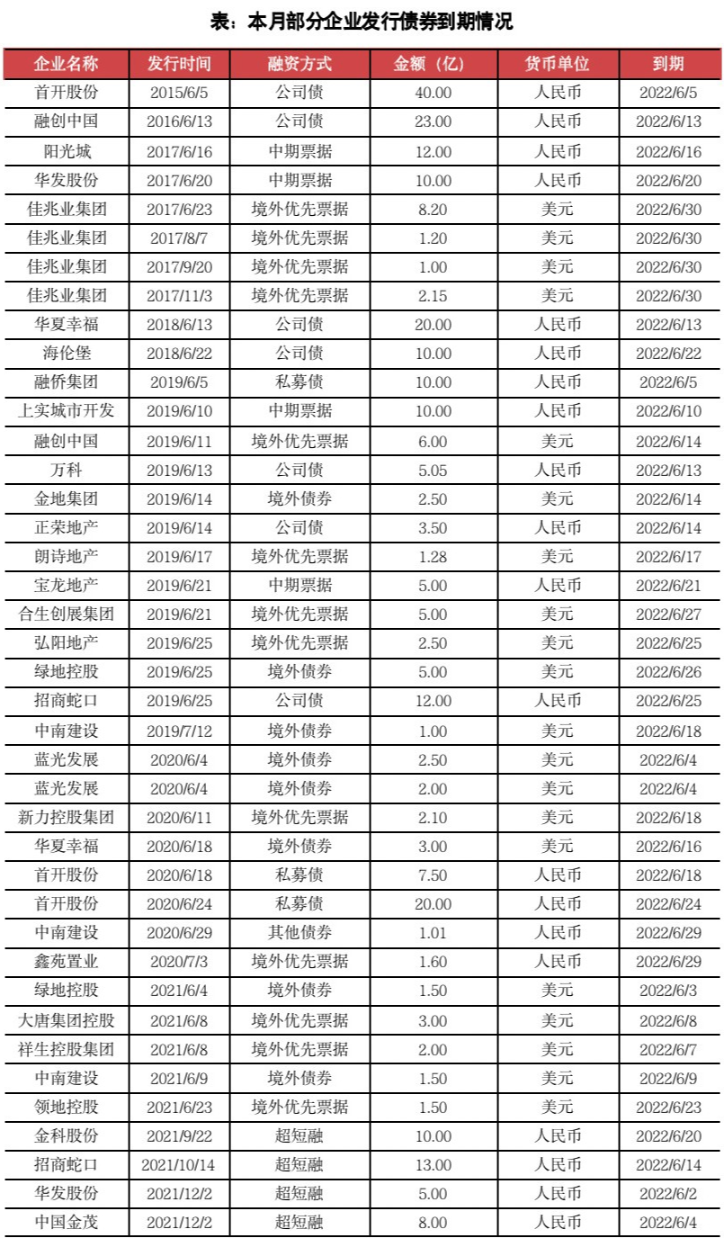 提前關(guān)注到2022年6月將有44筆債券到期,合計約639億元,環(huán)比增加68.6%,又一波償債潮即將到來。其中,佳兆業(yè)到期的4只境外優(yōu)先票據(jù)、新力到期的一只優(yōu)先票據(jù)以及華夏幸福的一筆境外債已經(jīng)出現(xiàn)了利息違約。從到期債券規(guī)模來看,單筆金額最高為佳兆業(yè)于2017年發(fā)行的8.2億美元的境外優(yōu)先票據(jù)。