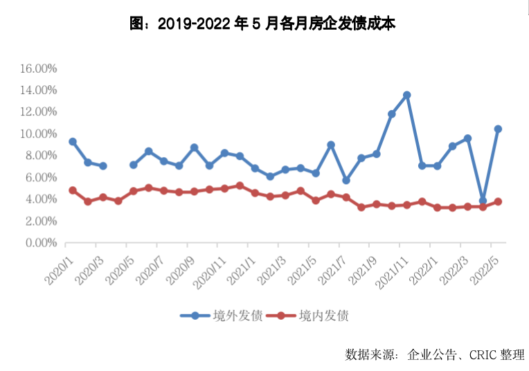 2022年5月100家典型房企新增債券類融資成本4.81%,環(huán)比上升1.55pct,同比下降0.4pct。其中境內(nèi)融資成本3.73%,環(huán)比上升0.5pct,發(fā)債主體仍是集中在中海、保利發(fā)展、華潤置地等國企央企;境外融資成本為10.38%,環(huán)比大幅提升了6.58pct,主要是因為上個月僅有遠洋集團發(fā)行了一筆成本較低的綠色債券,而本月則有中梁和大唐因為交換要約發(fā)行了3筆優(yōu)先票據(jù),融資成本都相對較高。2022年截至5月100家典型房企新增債券類融資成本4.39%,較2021年全年下降0.89個百分點,其中境外債券融資成本7.98%,較2021年全年上升0.96個百分點,境內(nèi)債券融資成本3.35%,較2021年全年下降0.71個百分點。