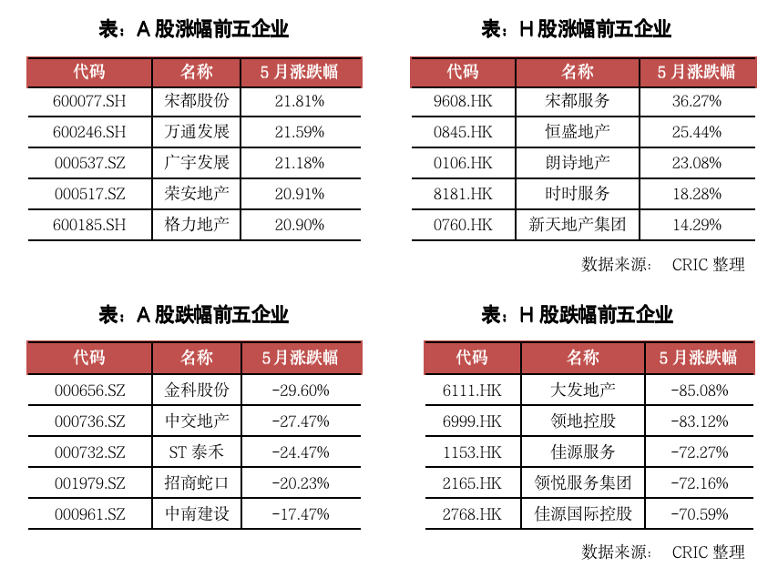 本月兩市的地產(chǎn)相關(guān)股表現(xiàn)都較為一般。A股地產(chǎn)股整月上漲的股票占比為56%,而H股整月上漲的股票占比則僅為26%。在H股方面,本月宋都服務(wù)的月漲幅達到了36.27%,是H股漲幅最大的地產(chǎn)相關(guān)股。企業(yè)從5月4日開始連續(xù)大漲,在11日甚至達到了近20%的漲幅,奠定了整月漲幅的基礎(chǔ),此后雖然股價略有波動,但是整月最終的漲幅仍然達到了36.27%。