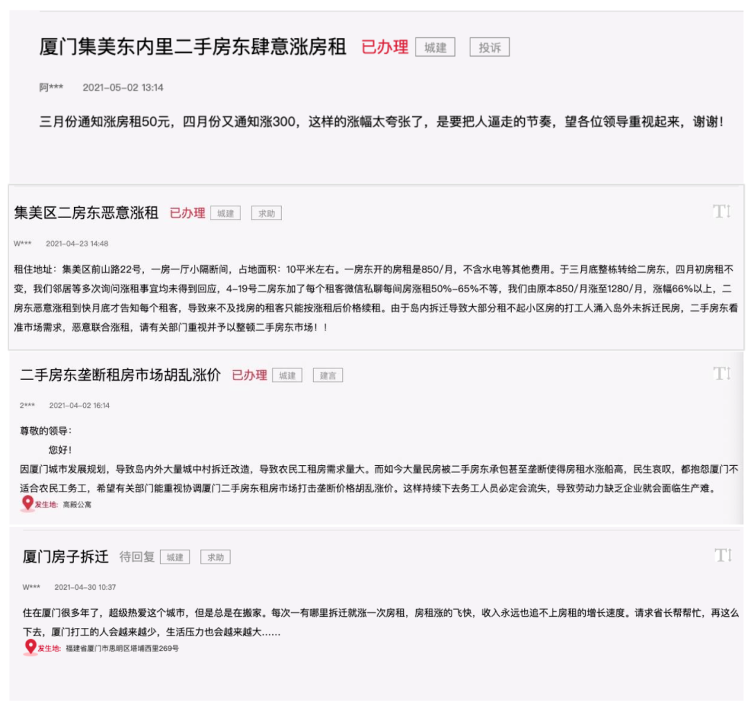 所以,沒有被拆遷波及的城中村以及小區的房源變得緊俏,租客們時不時就會收到房東發來的漲租問候。在人民網的「領導留言板上」,有不少廈門租客反映被無序漲租。